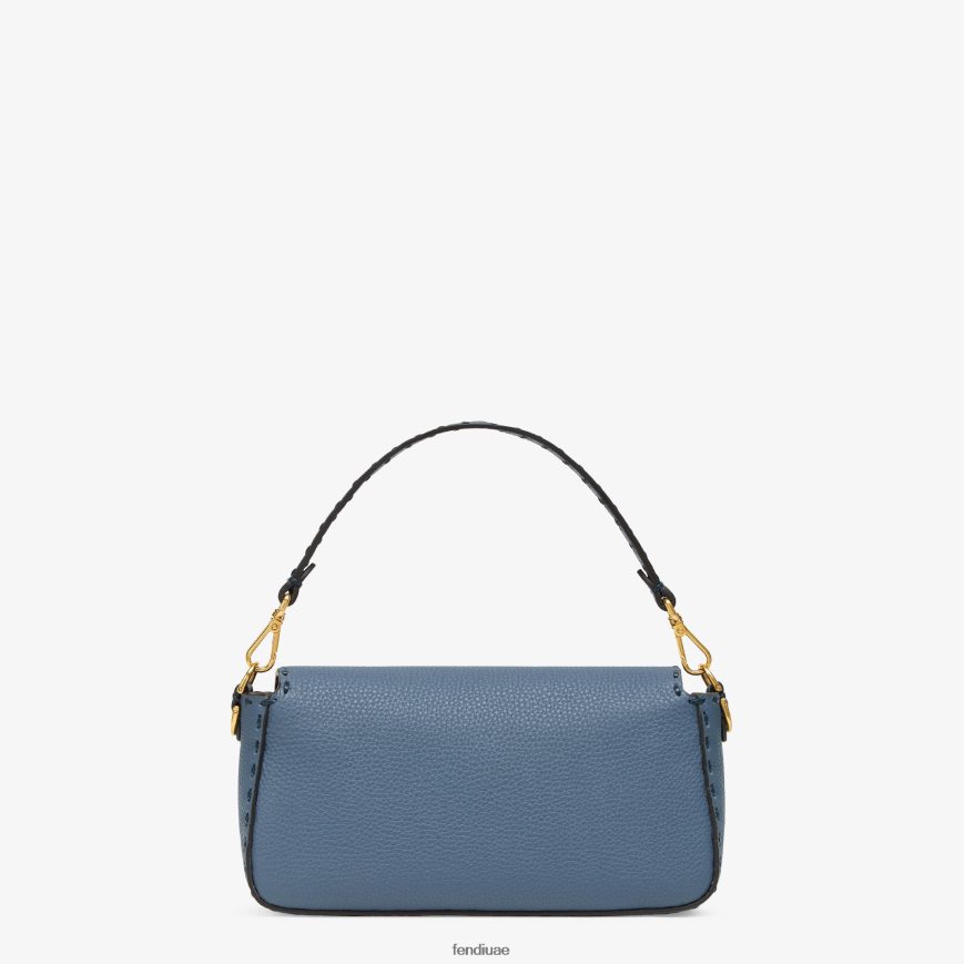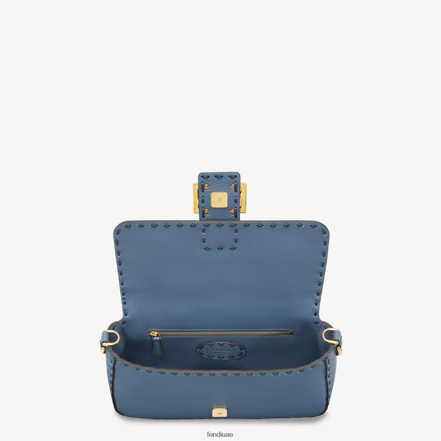 حقيبة باغيت متوسطة الحجم أيقونية مصنوعة من جلد كويو رومانو باللون الأزرق ومزينة يدويًا بخياطة متطابقة. مزين بمشبك ff. تتميز بغطاء أمامي، ومشبك مغناطيسي، وحجرة داخلية بجيب بسحاب، وختم سيليريا من الجلد، وأدوات معدنية ذهبية اللون عتيقة.