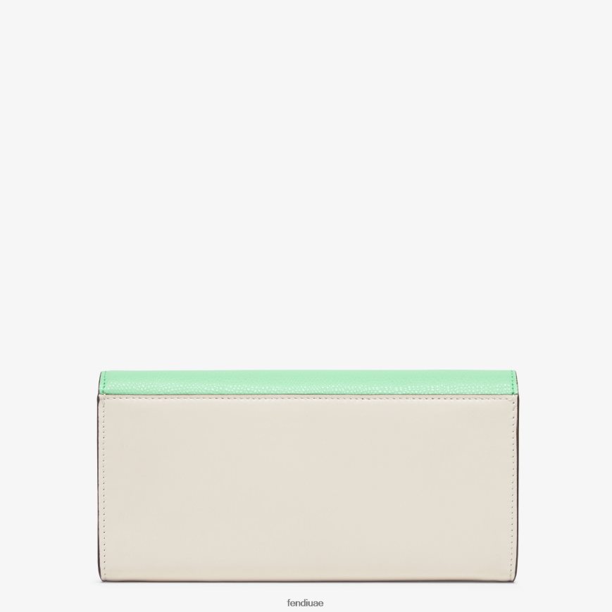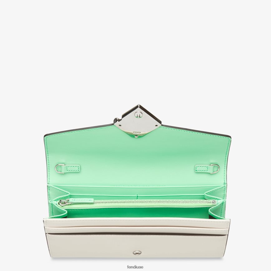 محفظة ff Diamonds كونتيننتال مع غطاء هندسي الشكل وشعار ff قطري وحزام سلسلة قابل للإزالة. تم تصميم الجزء الداخلي على شكل محفظة تحتوي على جزأين مقويين وجيب بسحاب وجيبين مسطحين وعشرة فتحات للبطاقات. مصنوع من الجلد الأبيض والأخضر. أدوات معدنية مطلية بالذهب.