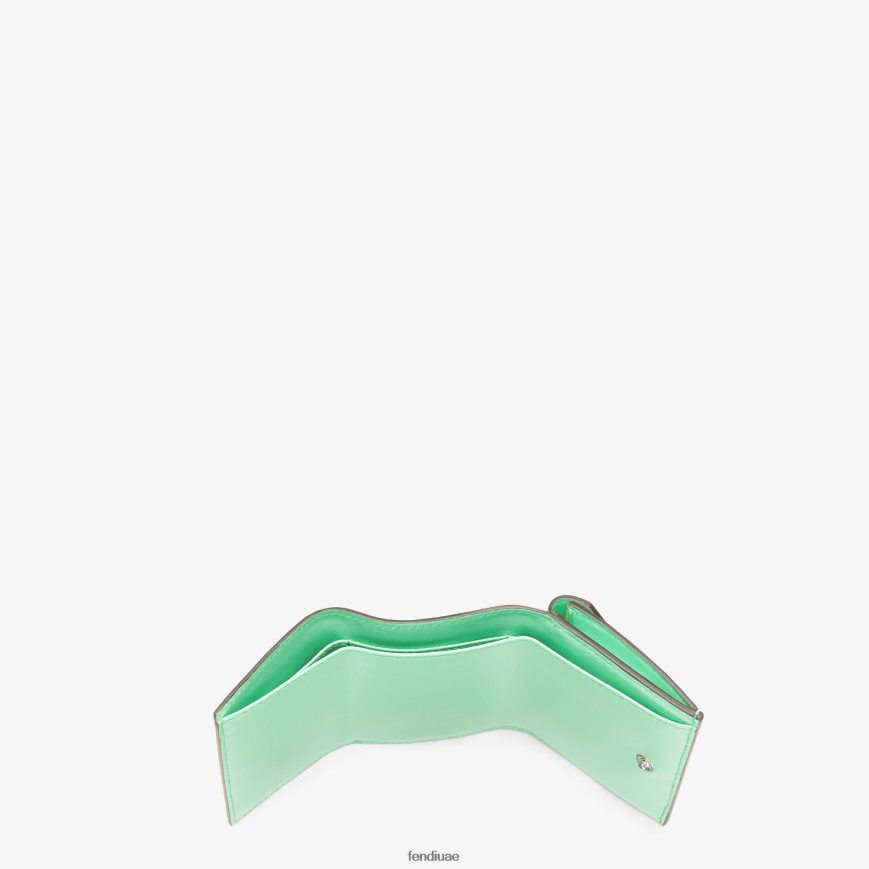 محفظة ff Diamonds ثلاثية الطي بتصميم مدمج وغطاء هندسي وشعار ff قطري. تتميز بجيب داخلي كبير للفواتير، وثلاثة حاملات مخفية للبطاقات ومحفظة خارجية للعملات المعدنية مع إغلاق سريع. مصنوع من الجلد الأبيض والأخضر. أدوات معدنية مطلية بالبلاديوم.