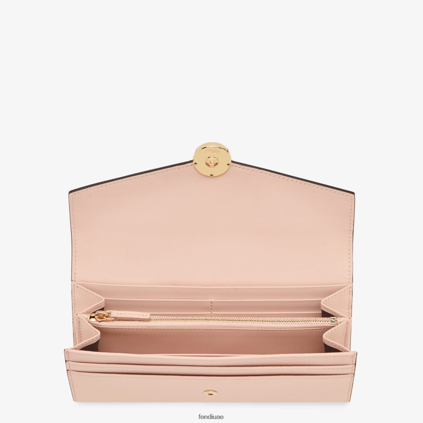 كونتيننتال إف هي محفظة فندي مثبتة بمسمار كبس. واسعة ومنظمة بشكل جيد، مع جيبين مقواين، وجيب بسحاب، وعشرة فتحات للبطاقات، وجيوب جانبية مسطحة. مصنوع من جلد كروز باللون الوردي الفاتح. أدوات معدنية مطلية بالذهب.