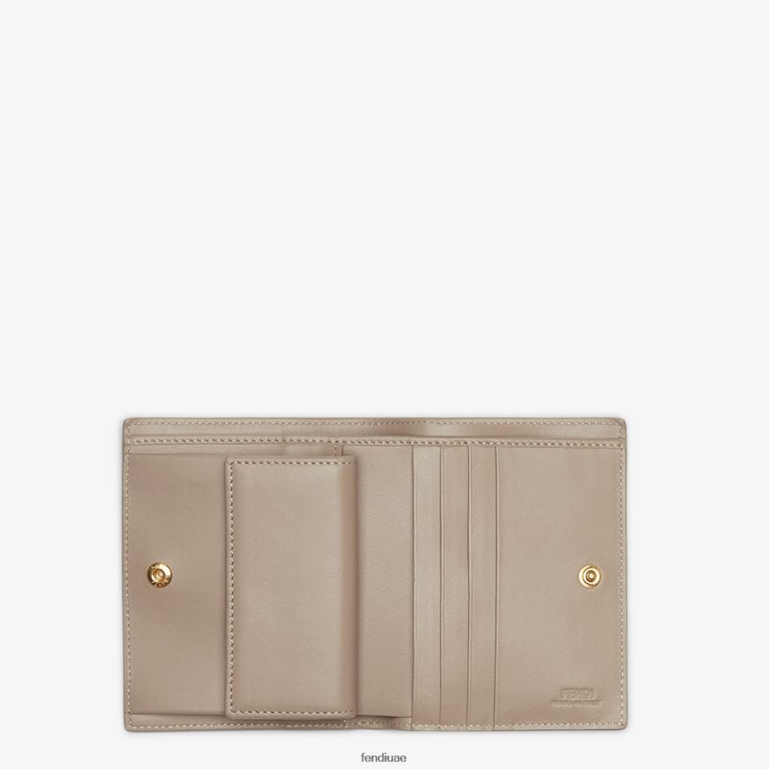 تتميز المحفظة المدمجة F بتصميم داخلي مزدوج الطي من فندي بجيب مسطح، ومحفظة للعملات المعدنية مع زر كبس وأربع فتحات للبطاقات. مصنوع من جلد كروز باللون البيج. أدوات معدنية ذهبية.