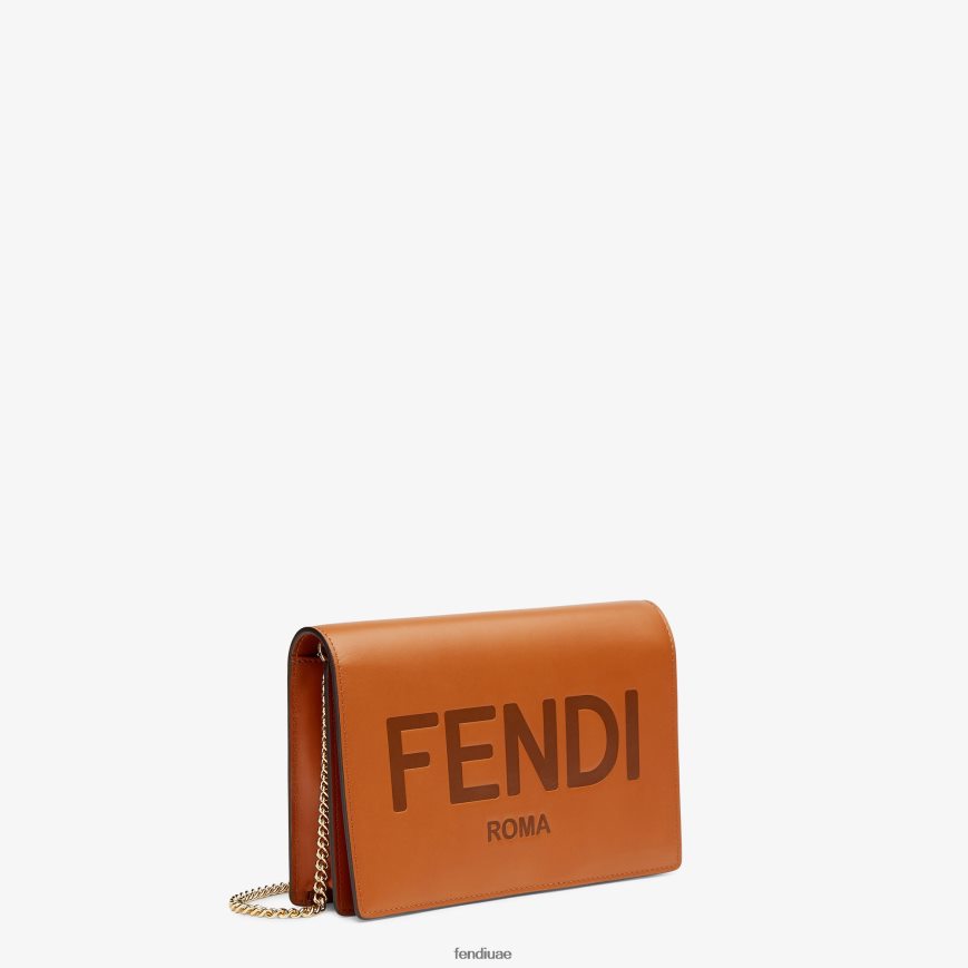 حقيبة صغيرة بتصميم هندسي، مصنوعة من الجلد باللون البني، مطبوع عليها شعار فندي روما.