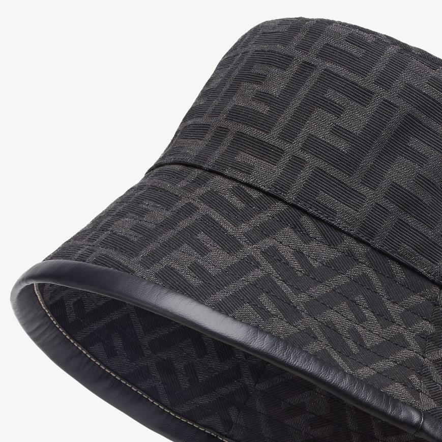 قبعة دلو مصنوعة من قماش الجاكار باللونين الأسود والرمادي. بلمسة نهائية من الجلد الأسود.