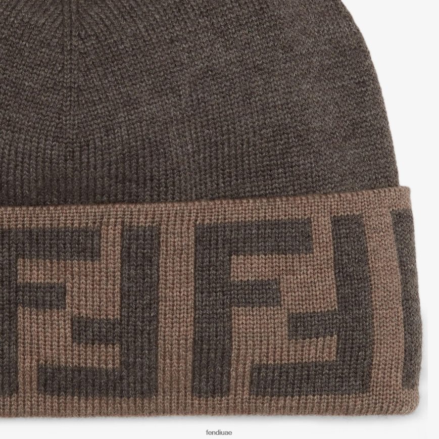 قبعة صغيرة مع حافة مطوية. مصنوع من الصوف الرمادي مع حدود باللون البيج المتباين وزخارف إنتارسيا كبيرة على شكل حرف ff.