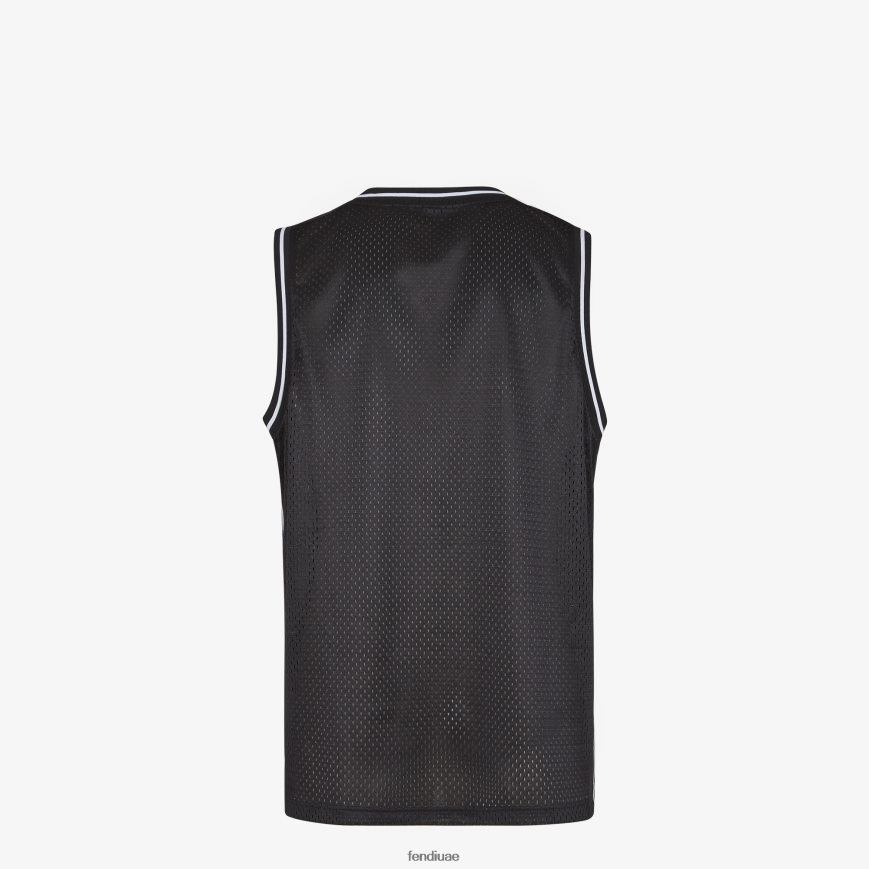 سترة شبكية سوداء على طراز كرة السلة. تم تخصيصه بتطريز حروف فندي روما المتباينة على الجهة الأمامية. حواف متماسكة مخططة باللونين الأسود والأبيض.