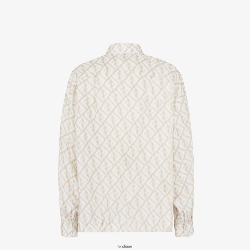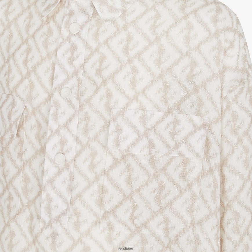 قميص كبير الحجم بحاشية برباط وجيوب رقعة بغطاء قلاب في الأمام. أكمام منخفضة القطع. إغلاق الزر. مصنوع من الكتان مع نقش ff مائل بتأثير ikat ومطبوع بالكامل باللونين الأبيض والبيج.