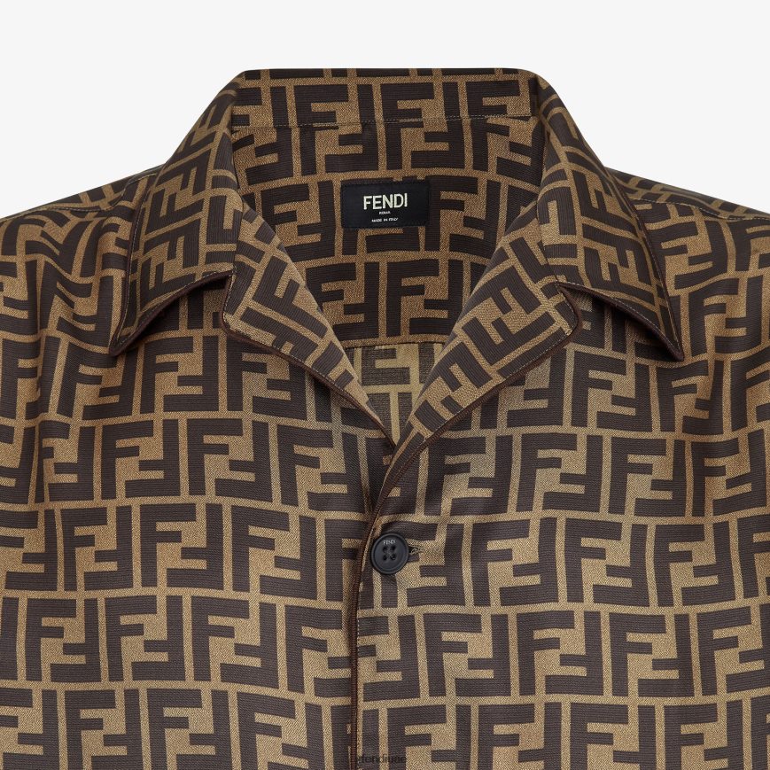 قميص مع الياقة الكوبية. قفل بزر مرئي بدرجة لون على لون. مصنوع من الحرير مع طباعة FF على كامل التصميم بظلال من اللون البني. تم تزيين الياقة والربط والأصفاد بحواف متباينة.