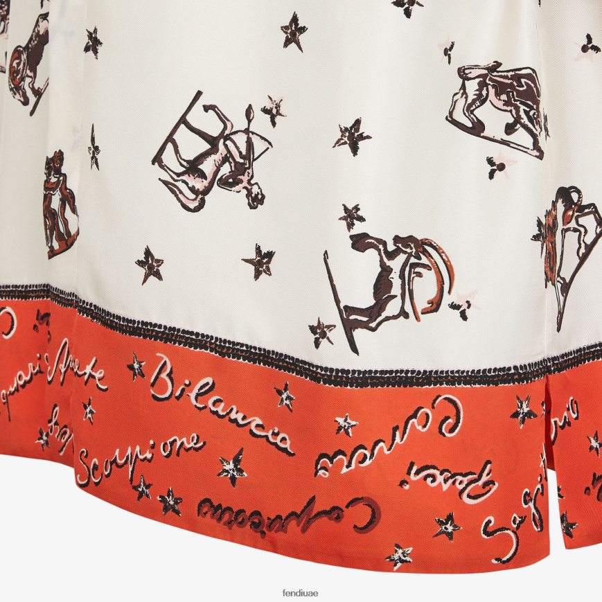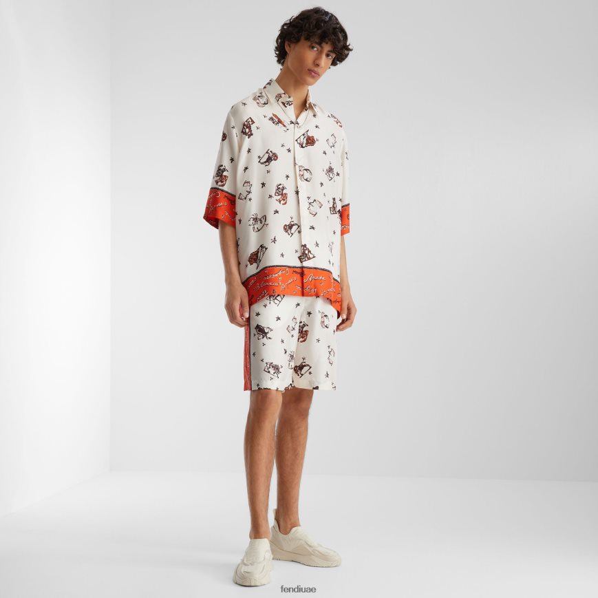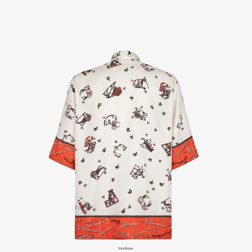 قميص كبير الحجم بياقة على الطراز الإيطالي وأكمام قصيرة. إبزيم بزر مخفي. مصنوع من الحرير الأبيض والبرتقالي. تم تخصيصه بطبعة علم التنجيم من فندي على كامل التصميم.