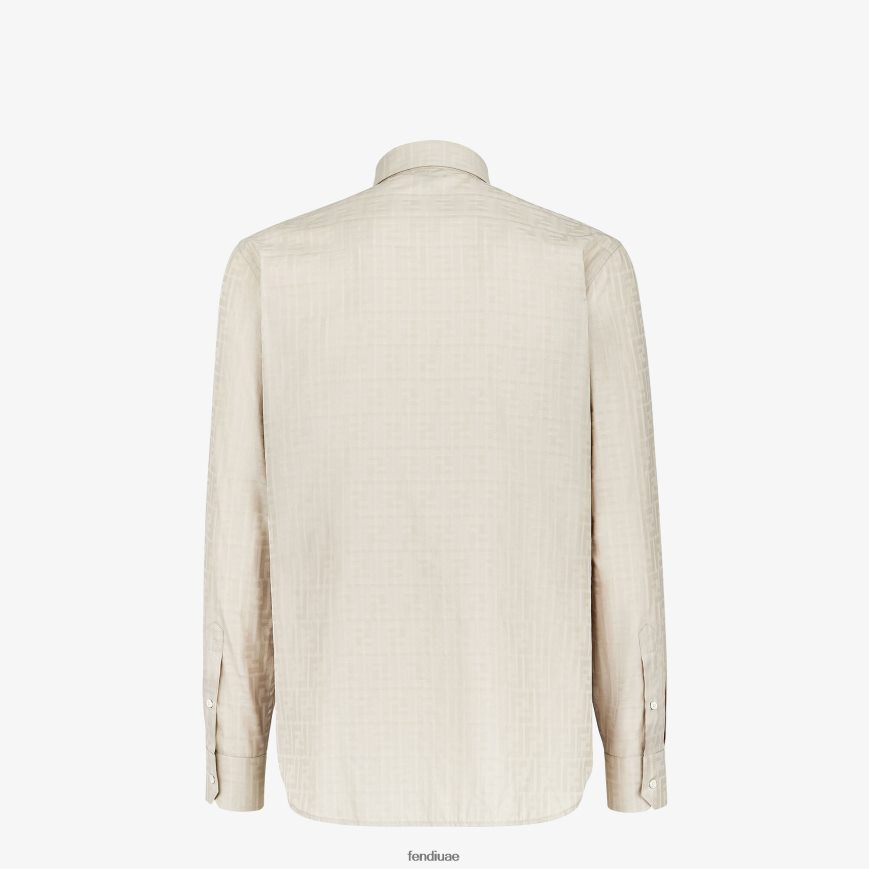 قميص ذو قصة عادية مع ياقة على الطراز الإيطالي. إغلاق مخفي بأزرار. مصنوع من القطن باللون البيج وموسلين الفيسكوز، مع زخرفة جاكار ff بالكامل. مزخرف بجيبين مقواين مع غطاء وزر على الصدر.
