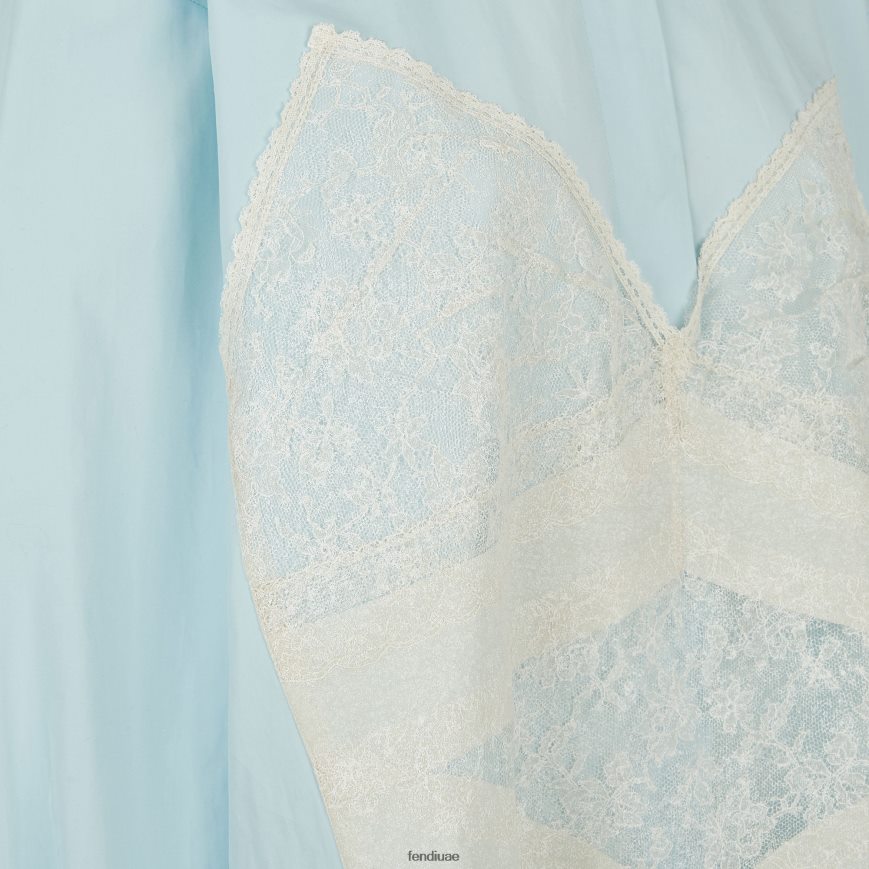 قميص كبير الحجم بتفصيلة trompe l' il من الأمام وأكتاف منسدلة وأكمام طويلة. حاشية مستديرة. إغلاق بزر مغطى. مصنوع من قماش البوبلين القطني باللون الأزرق الفاتح مع لوحة أمامية من الدانتيل الأبيض.