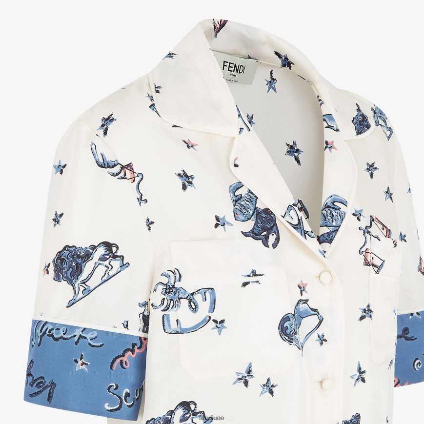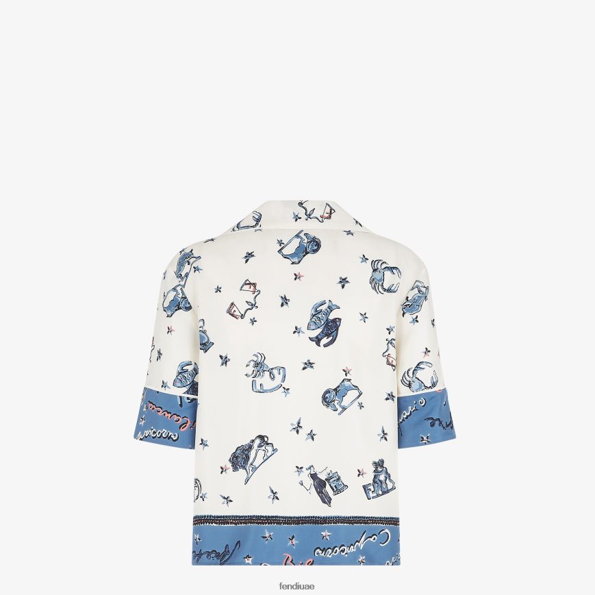 قميص متدفق بأكمام قصيرة. مصنوعة من نسيج قطني طويل من الحرير الأبيض والأزرق. تم تخصيصه بطبعة علم التنجيم من فندي على كامل التصميم. مزخرف بإطار أبيض.
