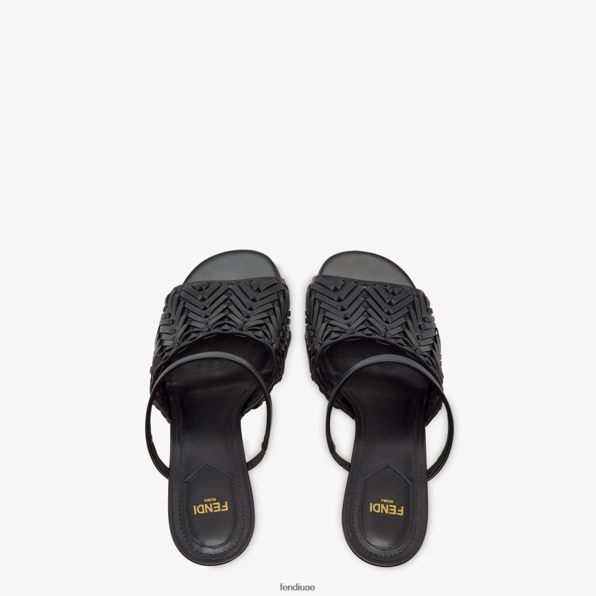 صندل فندي الأول ذو شريط وحزام عريض. مصنوع من الجلد الأسود المتداخل. كعب منحوت على شكل حرف F من المعدن الذهبي اللون.