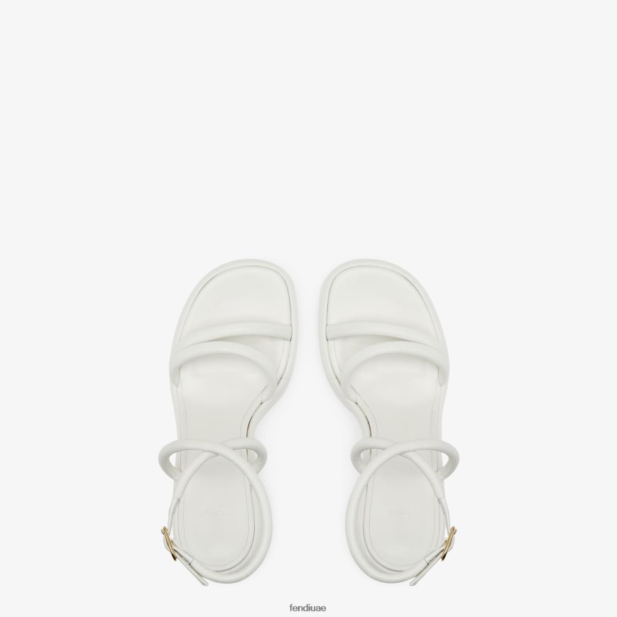 صندل باغيت مع أشرطة مبطنة قليلاً وحزام متقاطع على الكاحل والقوس. مصنوع من جلد النابا الأبيض. كعب مع تصميم باغيت ff من المعدن الذهبي.