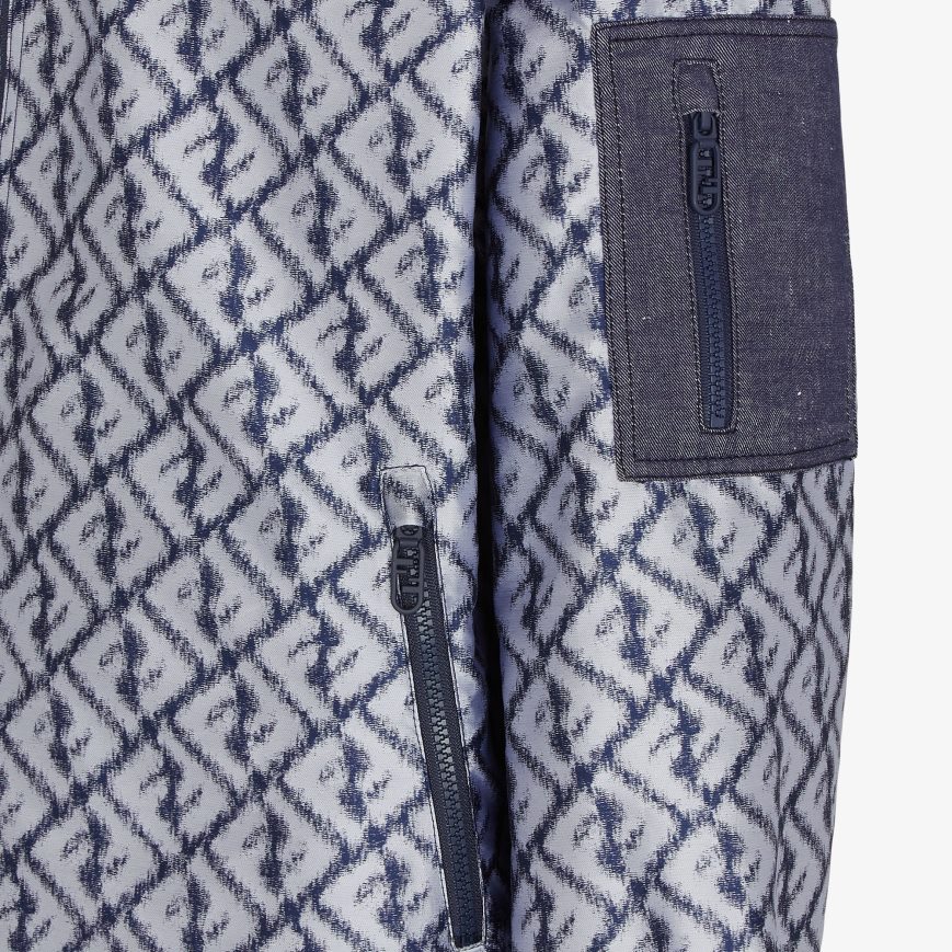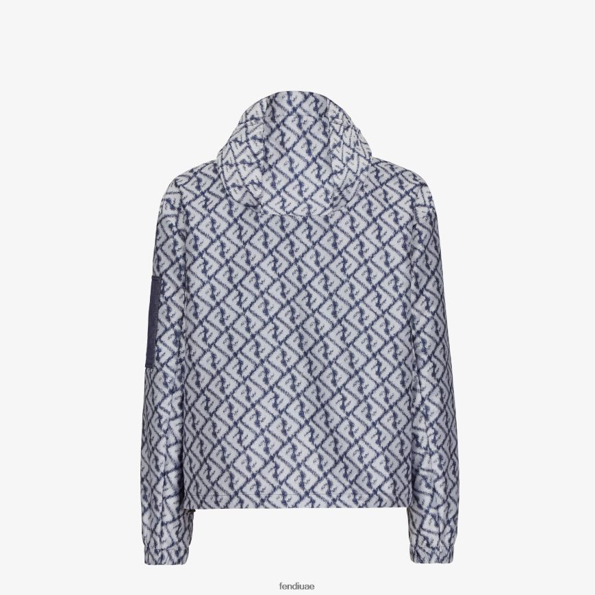 سترة واقية مع غطاء محرك السيارة. جيوب جانبية بسحاب وأساور مطاطية. اغلاق سحاب البنطلون. مصنوع من النايلون مع شعار ff قطري بتأثير ikat ومطبوع بالكامل باللونين الأزرق والأبيض. تم تشطيبه بتفاصيل شبكية فنية وجيب بسحاب على الكم الأيسر.