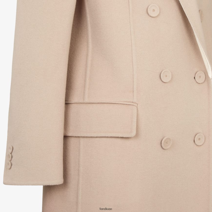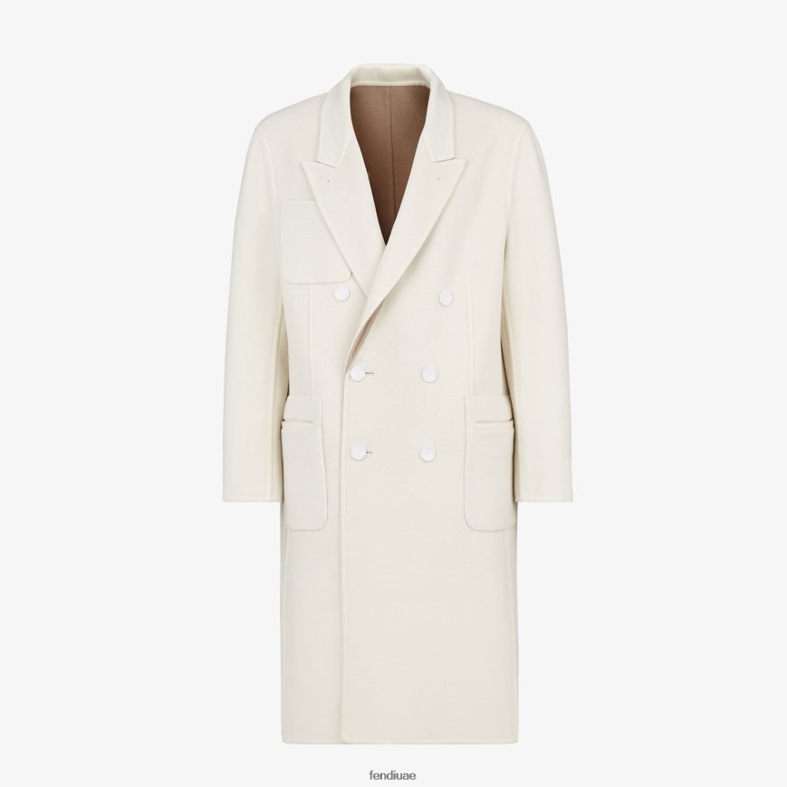 معطف مزدوج الصدر ذو وجهين، مع طية صدر السترة وجيوب بغطاء. إبزيم الزر. مصنوع من الكشمير على الوجهين، جانب بيج والآخر أبيض.