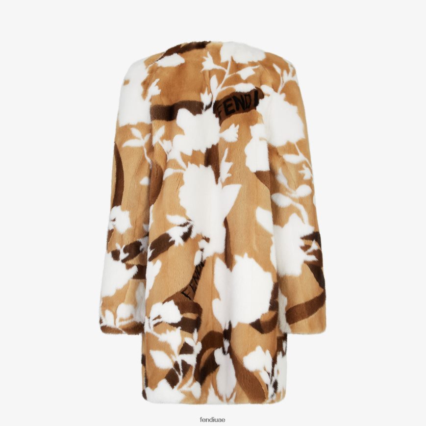 معطف قصير بقصة كيمونو وياقة على شكل حرف V وأكمام طويلة مع فتحات على الأساور. مصنوعة من فرو المنك ومطعمة بالكامل بزخارف ورود فندي باللونين البني والأبيض. طلاء نابا من الداخل.