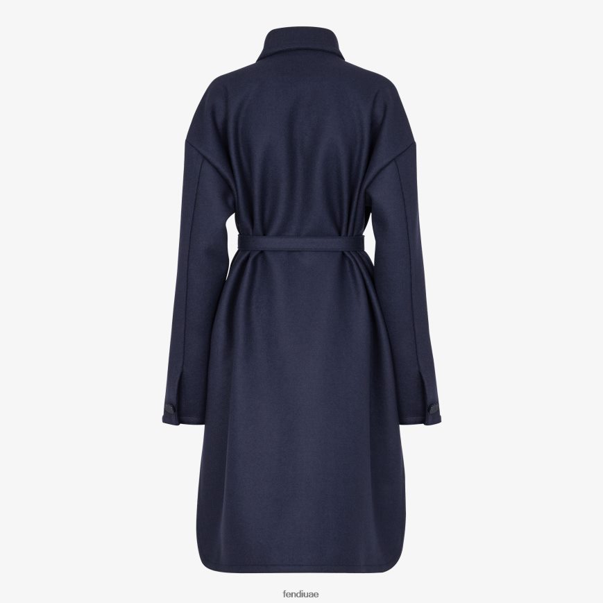 معطف بقصة مستقيمة وياقة قميص وأكمام منخفضة القطع. جيوب ماكسي التصحيح على الصدر. إغلاق بصدر واحد مع أزرار وحزام مطابق عند الخصر بإبزيم معدني من فندي أولوك. مصنوعة من الصوف الأزرق الداكن. تم تشطيب الجيوب بزخرفة خياطة سيليريا المرتفعة. أزرار ff karligraphy مخصصة.