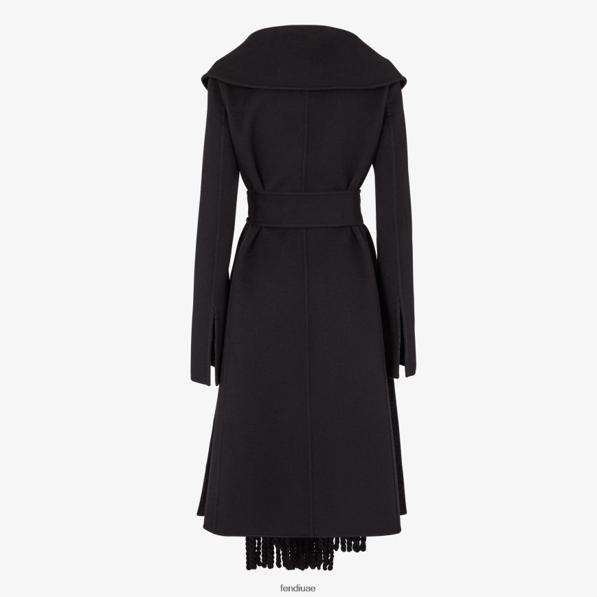 معطف بياقة شال واسعة وفتحات جانبية عميقة. إغلاق على شكل رداء مع حزام مطابق. مصنوع من قماش مزدوج من الصوف الأسود مع بطانة متطابقة اللون مع شعار ff. حزام الربط مزين بشراريب صوف طويلة مصنوعة يدويًا بنفس الألوان.