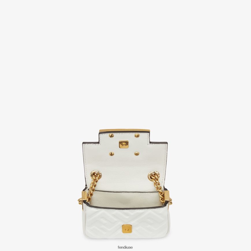 نسخة نانو من الحقيبة الأيقونية ذات السلسلة الرغيف الفرنسي، مع غطاء ومقبض وقفل مغناطيسي. يمكن حملها باليد أو ارتداؤها حول الجسم بفضل حزام الكتف ذو السلسلة المنزلقة. حامل بطاقة الائتمان جيب مسطح بالداخل. مصنوع من جلد نابا باللون الأبيض مع زخرفة FF منقوشة. أدوات معدنية مطلية بالذهب.
