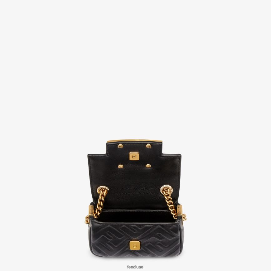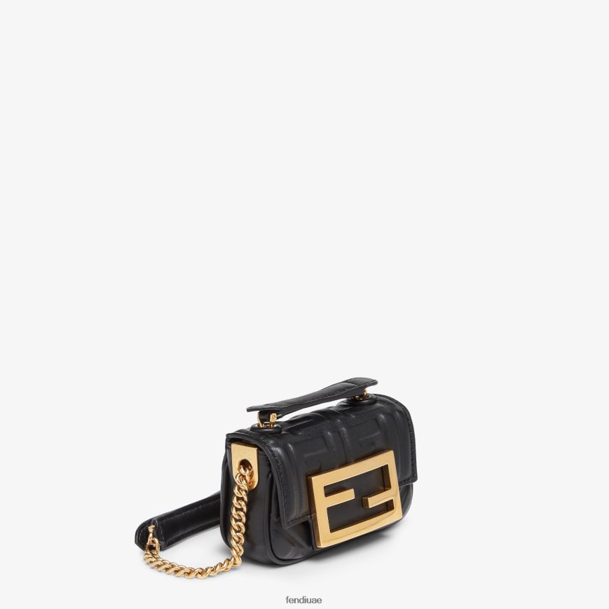 نسخة نانو من حقيبة الرغيف الفرنسي الشهيرة، مزودة بغطاء ومقبض وقفل مغناطيسي. يمكن حملها باليد أو ارتداؤها حول الجسم بفضل حزام الكتف ذو السلسلة المنزلقة. حامل بطاقة الائتمان جيب مسطح بالداخل. مصنوع من جلد نابا باللون الأسود مع زخرفة FF منقوشة. أدوات معدنية مطلية بالذهب.