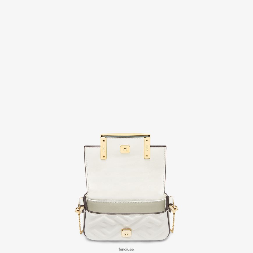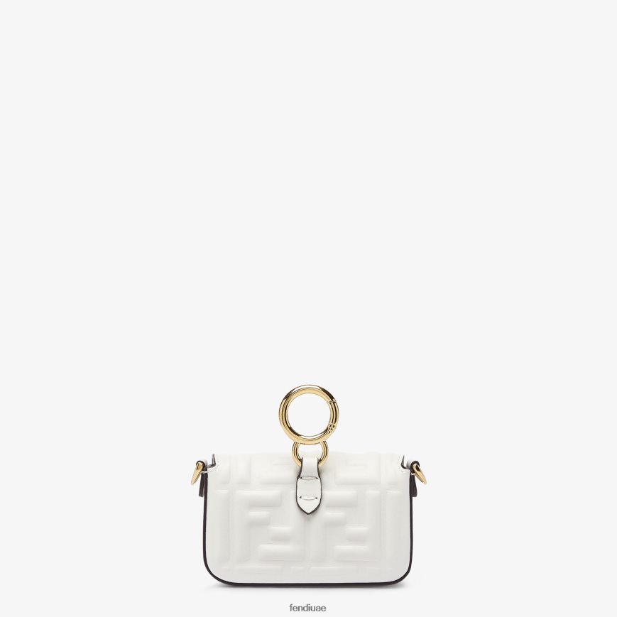 نسخة نانو من حقيبة الرغيف الفرنسي الشهيرة، مع غطاء وقفل مغناطيسي. يسمح المشبك بربطه بأكياس أو أحزمة أكبر. ويمكن أيضًا ارتداؤها بشكل متقاطع بفضل حزام الكتف الرفيع. بطانة مع جيب مسطح. مصنوع من جلد النابا الأبيض. انتهى بزخارف ff منقوشة. أدوات معدنية مطلية بالذهب.