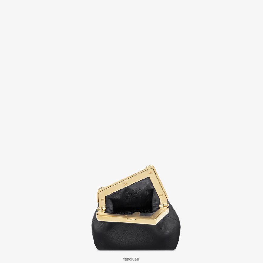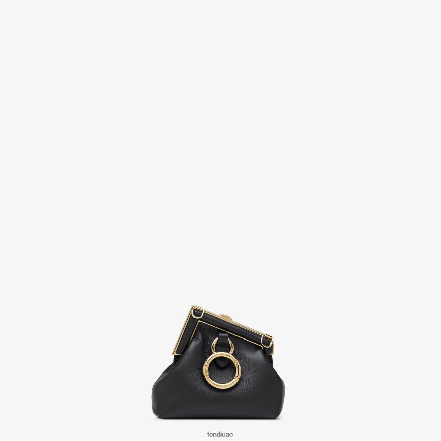 حقيبة Fendi First nano، مزودة بمشبك ومشبك قطري على شكل حرف FF في الخلف يسمح بربطها بحقائب أو أحزمة أكبر مثل التعويذة. ويمكن أيضًا ارتداؤها على شكل الجسم بفضل حزام الكتف الرفيع القابل للتعديل. إنه الشكل المثالي لحمل سماعات الأذن اللاسلكية airpods أو airpods pro. مصنوع من جلد نابا باللون الأسود. أدوات معدنية مطلية بالذهب.