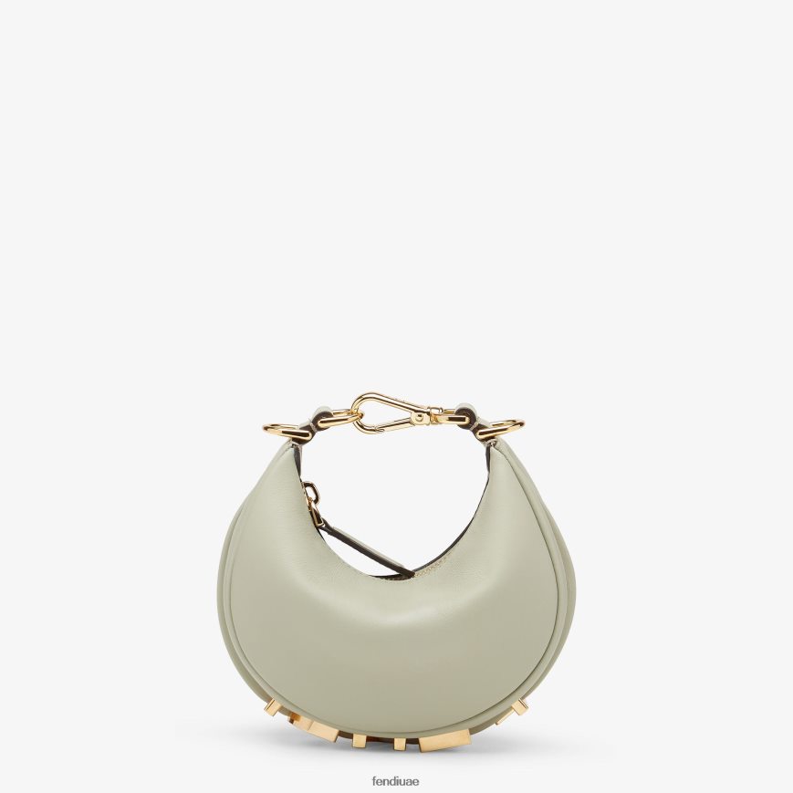 حقيبة هوبو نانو فنديجرافي مع سحاب للإغلاق، ومزينة بحروف فندي معدنية ذهبية عتيقة. يسمح الحزام القابل للتعديل مع المشبك بربطها بحقائب أكبر أو ارتدائها على المعصم. يأتي مع خطافات لحزام الكتف. مصنوع من الجلد الأخضر. أدوات معدنية مطلية بالذهب.