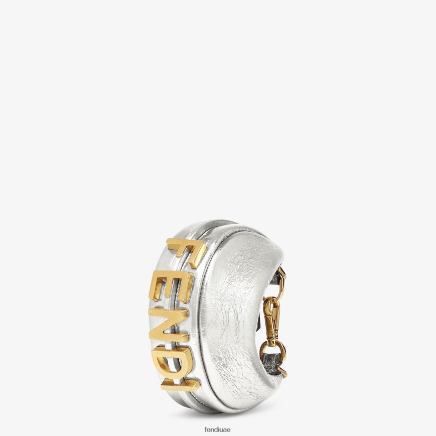 حقيبة نانو فنديجرافي هوبو مع سحاب للإغلاق، ومزينة بحروف فندي معدنية ذهبية عتيقة. يسمح الحزام القابل للتعديل مع المشبك بربطها بحقائب أكبر أو ارتدائها على المعصم. يأتي مع خطافات لحزام الكتف. مصنوع من جلد فضي مصقول بتأثير كراكيلي. أدوات معدنية مطلية بالذهب.