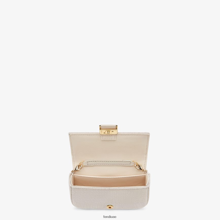حقيبة باغيت أيقونية بنسخة النانو، مزودة بغطاء وشعار ff ومشبك مغناطيسي. يسمح المشبك بربطه بأكياس أو أحزمة أكبر. ويمكن أيضًا ارتداؤها بشكل متقاطع بفضل حزام الكتف الرفيع. بطانة مع جيب مسطح. مصنوعة من قماش البيج. تم تشطيبه بزخرفة ff مطرزة بخيط متعدد الألوان. أدوات معدنية مطلية بالذهب.