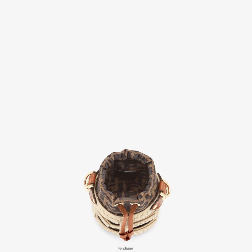 حقيبة دلو نانو مع حجرة داخلية مبطنة بقماش الجاكار بنقش ff باللون البني والتبغ. يتم تحديد الشكل الأسطواني للحقيبة من خلال حروف فندي المصنوعة من الرافية المضفرة باللون الأصفر الفاتح.