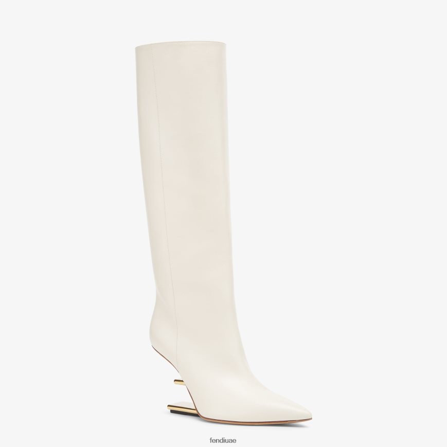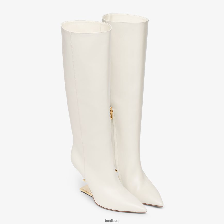حذاء فندي الأول بمقدمة مدببة وسحاب جانبي من الداخل مع سحاب فندي أولوك. مصنوع من الجلد الأبيض. كعب منحوت على شكل حرف F من المعدن الذهبي اللون.