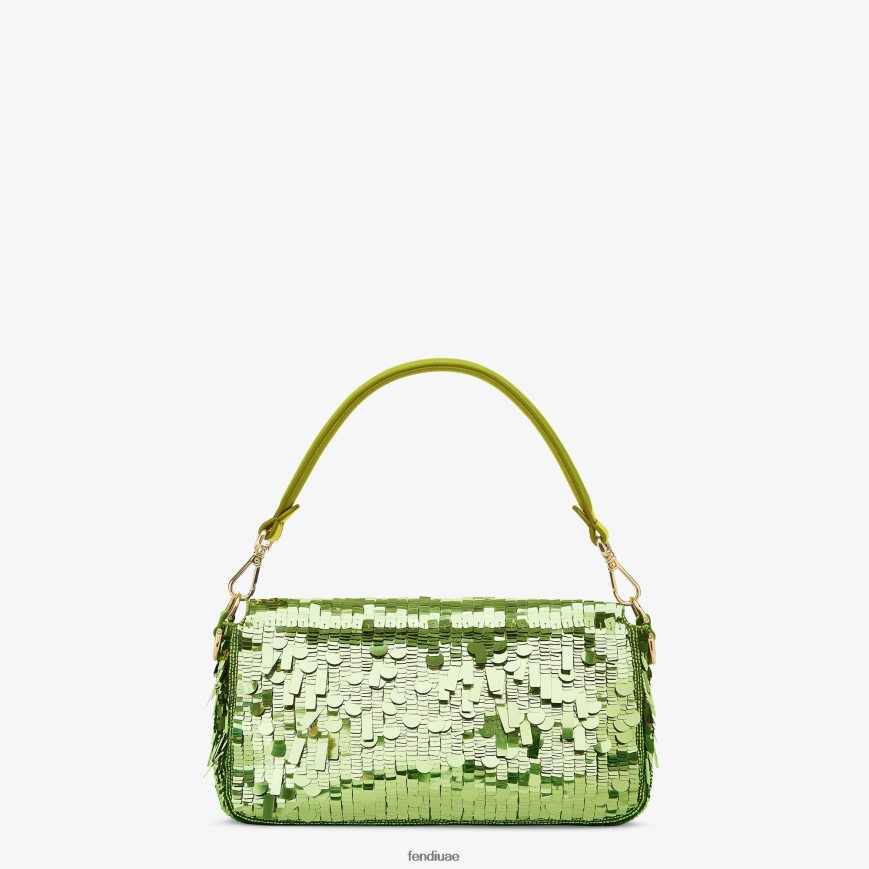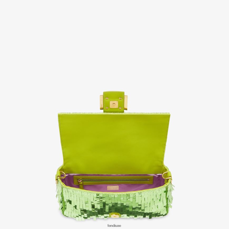 حقيبة باغيت متوسطة الحجم ومطرزة بالكامل بالترتر المعدني باللون الأخضر الحمضي بأشكال وأحجام مختلفة. مزين بمشبك ff.