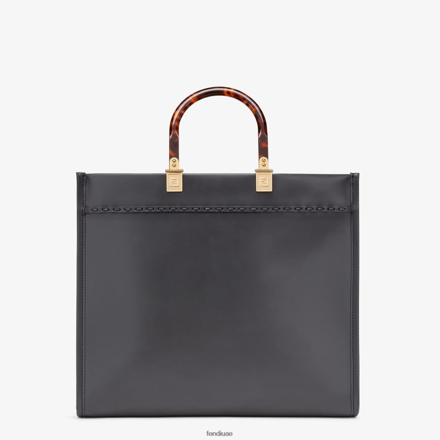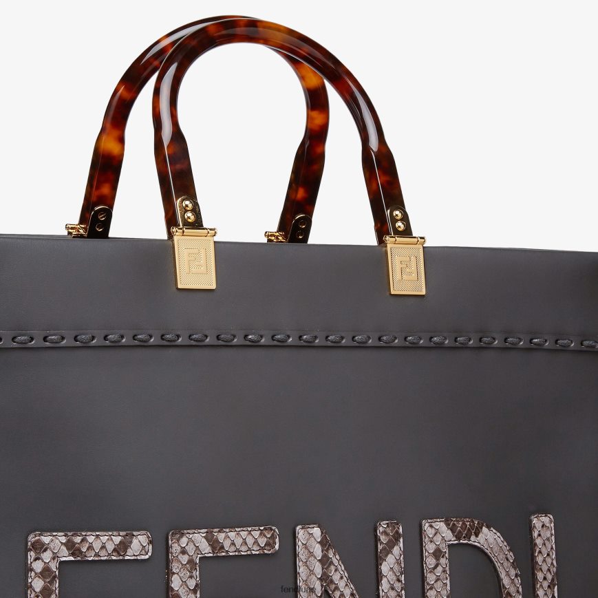 حقيبة تسوق متوسطة الحجم مصنوعة من الجلد باللون الرمادي الداكن، ومزينة بحروف فندي روما في شكل الثعبان المطبوع ومقابض زجاجية صلبة بتأثير صدفة السلحفاة.