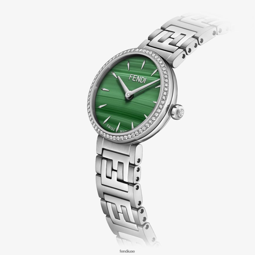 علبة مصقولة ومصقولة من الفولاذ المقاوم للصدأ، إطار مرصع بـ 64 ماسة، حوالي 0.14 قيراط، تاج مرصع بماسة واحدة، حوالي 0.02 قيراط. ميناء من الملكيت الأصلي، ومؤشرات وعقارب فضية اللون. سوار من الفولاذ المقاوم للصدأ بلمسة نهائية من الساتان، مع وصلات مركزية لامعة تحمل شعار ff وإبزيم قابل للطي.