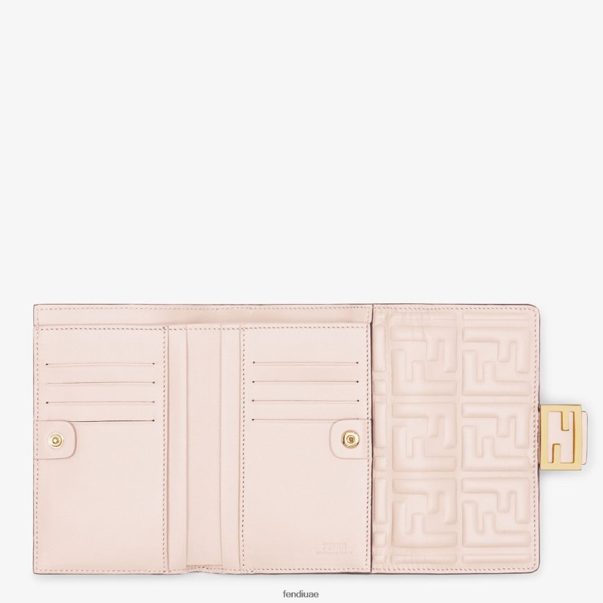 محفظة باغيت متوسطة الحجم، مزودة بغطاء وزر مغناطيسي للإغلاق. الجزء الداخلي منظم بجيبين مسطحين، وجيب للفواتير وثمانية فتحات لحمل البطاقات. المقصورة الخلفية مع اثنين من جيوب مجمعة. مصنوع من جلد نابا باللون الوردي مع زخرفة FF منقوشة. أدوات معدنية مطلية بالذهب.