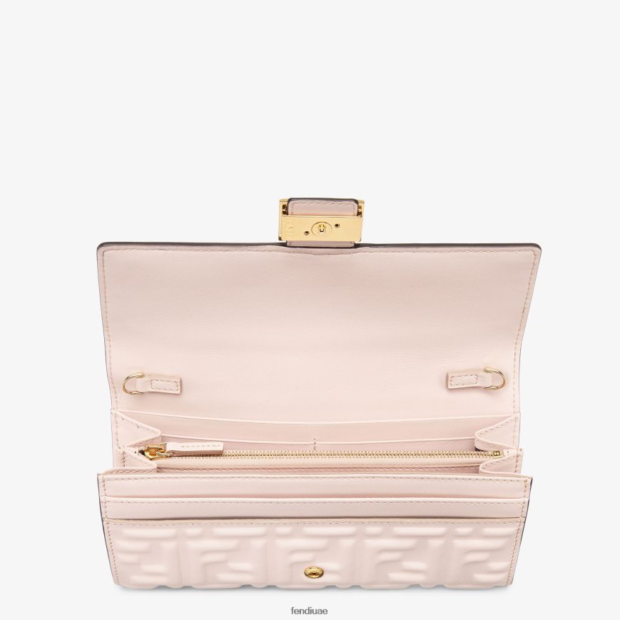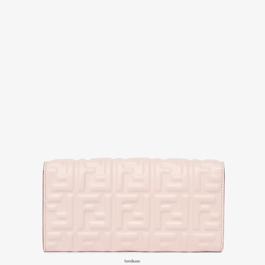 محفظة باجيت كونتيننتال مع حزام كتف رفيع من سلسلة قابل للفصل. تم تصميم الجزء الداخلي على شكل محفظة تحتوي على جزأين مقويين وجيب بسحاب وجيبين مسطحين وعشرة فتحات للبطاقات. مصنوع من جلد نابا باللون الوردي مع زخرفة FF منقوشة. أدوات معدنية مطلية بالذهب.