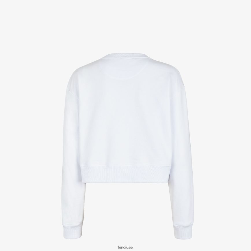 سويت شيرت قصير بياقة دائرية وأكمام طويلة. مصنوع من قطن الجيرسيه الأبيض. يحمل العلامة التجارية فندي روما بحروف مطرزة باللون الأسود على الجهة الأمامية.