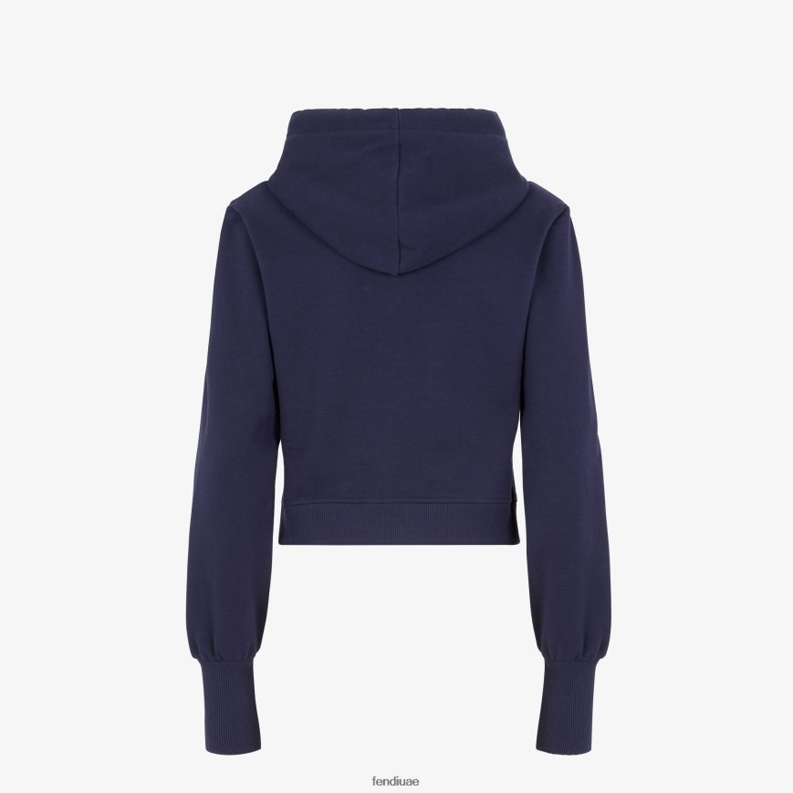 سويت شيرت قصير بغطاء رأس برباط وأكمام طويلة. مصنوع من قطن الجيرسيه الأزرق. يحمل العلامة التجارية فندي روما بحروف مطرزة باللون الأبيض على الجهة الأمامية.