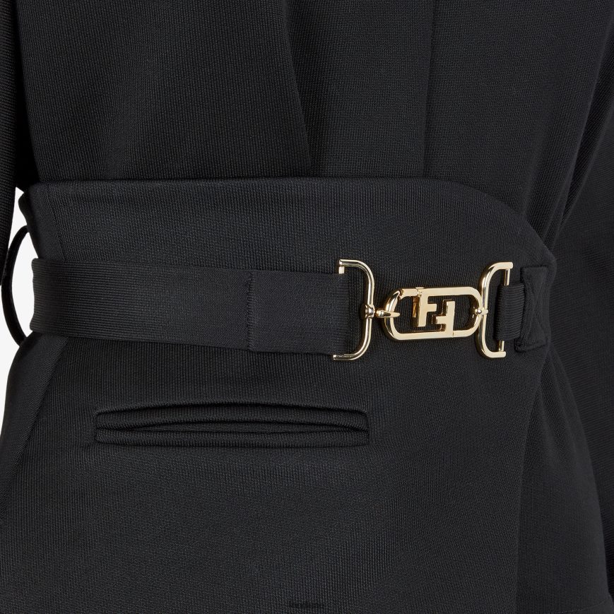 سترة قصيرة بأكمام طويلة. يتميز الثوب بحزام قابل للإزالة مع بيبلوم جانبي وجيب بحاشية. إبزيم معدني من فندي أولوك مع لمسة نهائية ذهبية. مصنوع من الجيرسيه الأسود الناعم.