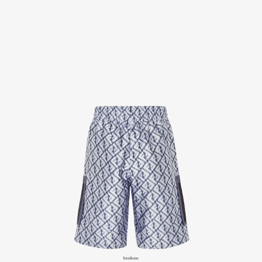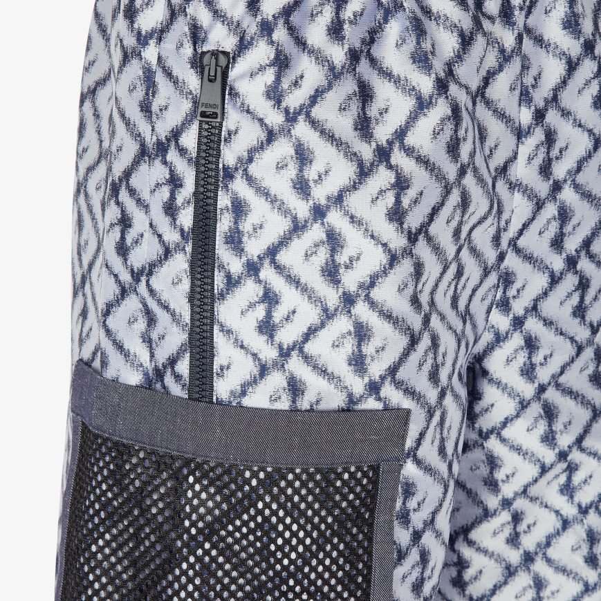 برمودا مع جيوب جانبية بسحاب وخصر مطاطي برباط. مصنوع من النايلون مع شعار ff قطري بتأثير ikat ومطبوع بالكامل باللونين الأزرق والأبيض. مزين بجيوب كارجو مصنوعة من قماش شبكي ودنيم بنفس اللون.