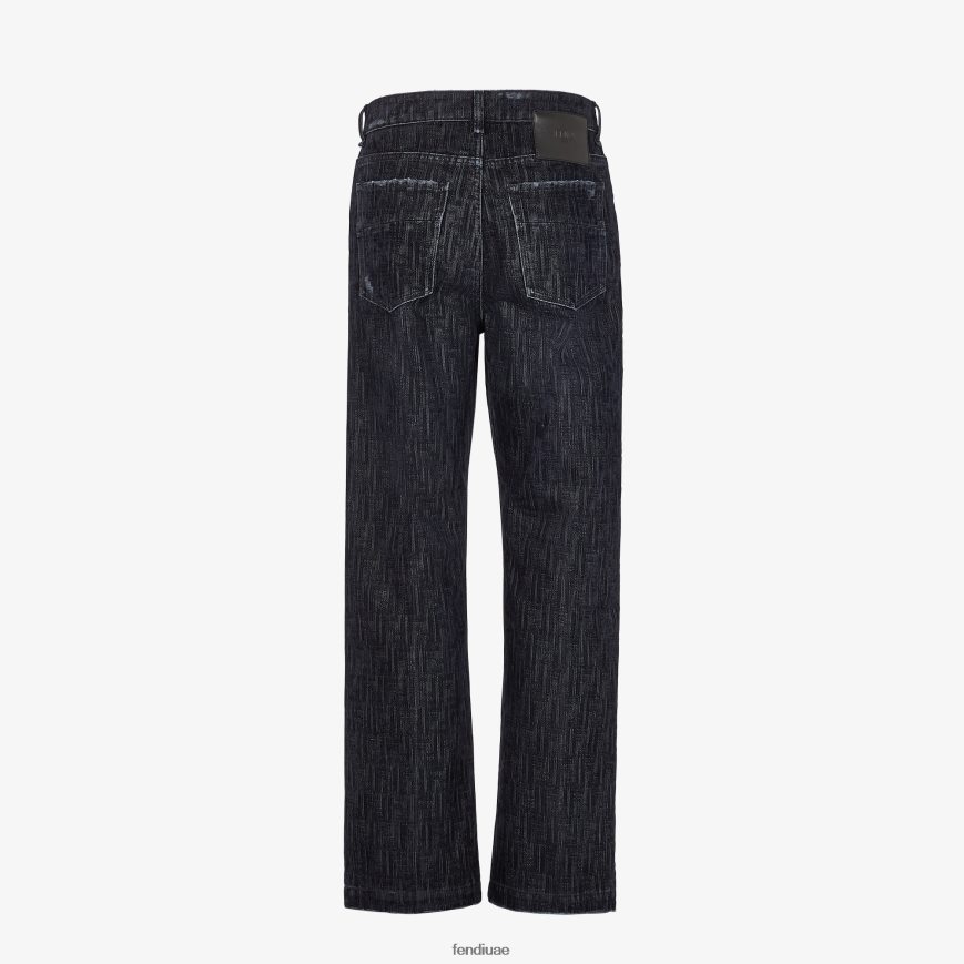 بنطال بقصة مستقيمة و5 جيوب. إغلاق بسحاب وزر. مصنوع من قماش الدنيم الأزرق مع تصميم ff متدفق على كامل التصميم. علاج يرتديه عند الخصر وعلى الجيوب. رقعة فندي جلدية في الخلف.