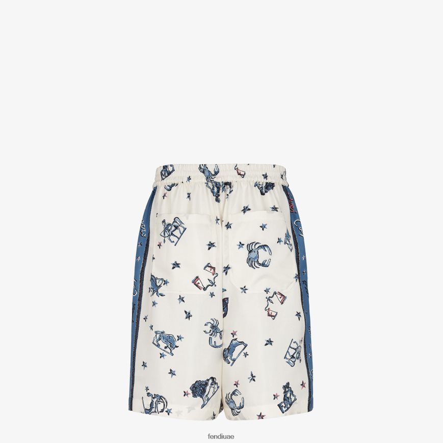 شورت بخصر مرن وحلقات للحزام. جيوب جانبية وجيوب رقعة في الخلف. إغلاق بسحاب مخفي. مصنوع من الحرير باللونين الأزرق والأبيض. تم تخصيصه بطبعة علم التنجيم من فندي على كامل التصميم.