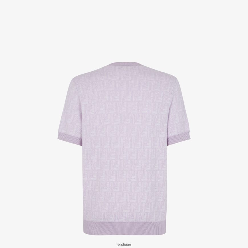 سترة بأكمام قصيرة ورقبة دائرية. حواف مضلعة. مصنوع من خيوط الصوف مع نقش ظل فندي إنتارسيا باللون الأرجواني والأبيض.