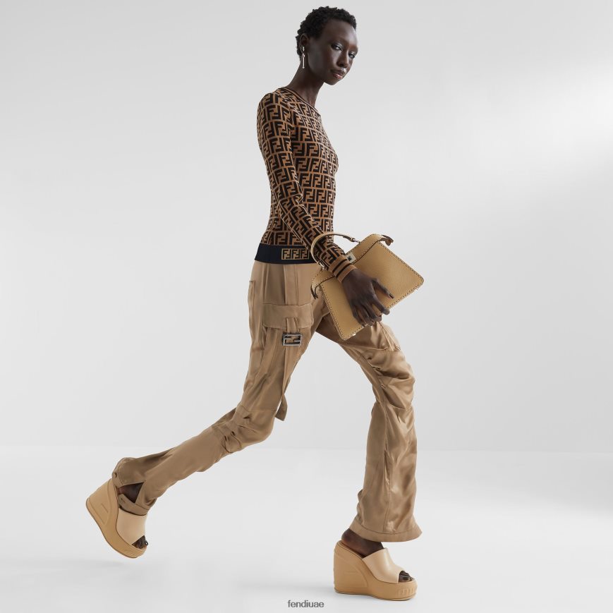 سترة بأكمام طويلة ومناسبة. انتهى بحواف مضلعة. مصنوع من نسيج الفيسكوز مع شعار ff باللونين الأسود والبني. حواف مضلعة باللون الأسود مع خطوط متباينة الألوان.
