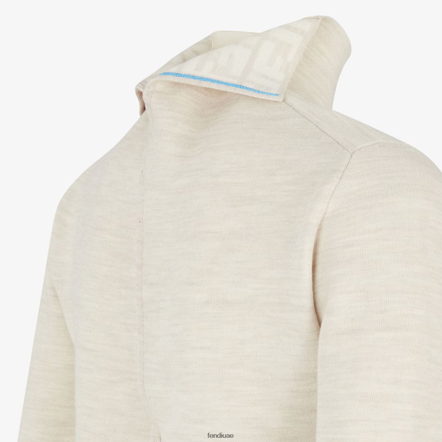 بلوفر بوجهين وأكمام طويلة. تم الانتهاء من الياقة العالية بشق في منتصف الظهر. مصنوع من خيوط الصوف مع جانب واحد بلون بيج وزخرفة ff بالكامل بنفس اللون على الجانب الآخر. تم تشطيبه بأنابيب وربطة عنق داخلية عند الياقة باللون الأزرق الفاتح.