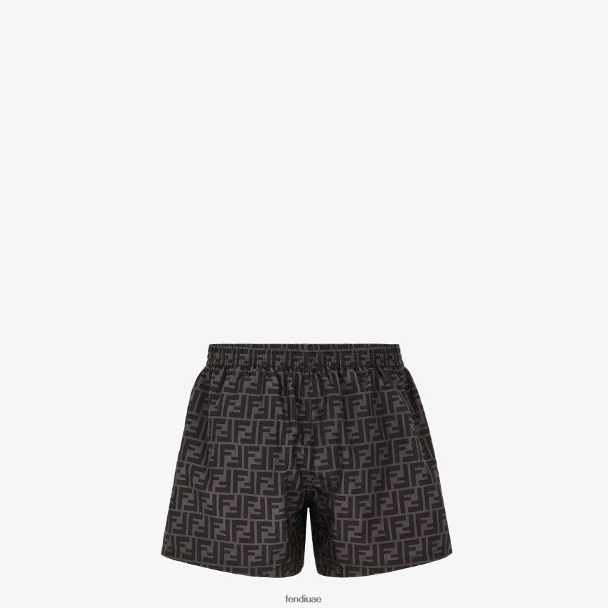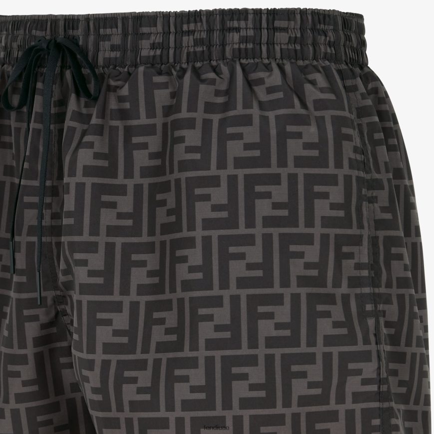 شورت سباحة بحزام خصر مطاطي ورباط. مصنوع من قماش تقني بنمط ff باللونين الأسود والرمادي.