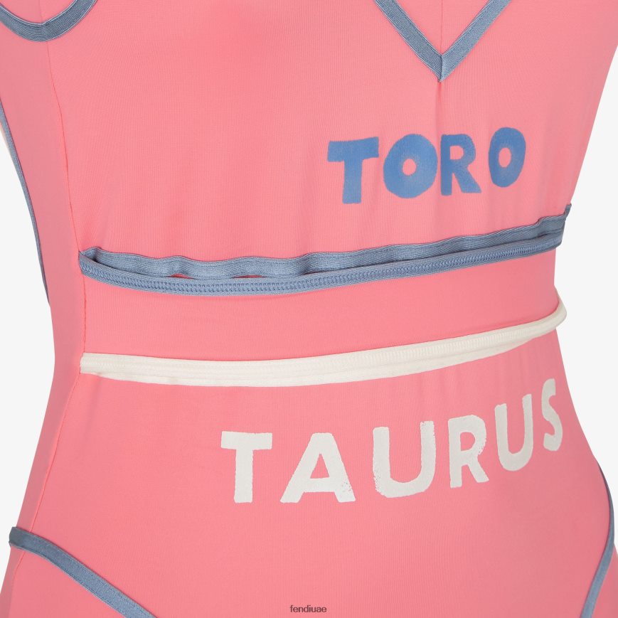 ملابس سباحة برقبة على شكل حرف V وظهر عاري. مصنوع من الليكرا الوردي مع طباعة حروف تنجيم فندي متباينة على الجهة الأمامية. مزين بأنابيب مزدوجة على الحواف وخط الخصر باللونين الأزرق الفاتح والأبيض. حقيبة متطابقة مع رباط وشعار فندي روما.