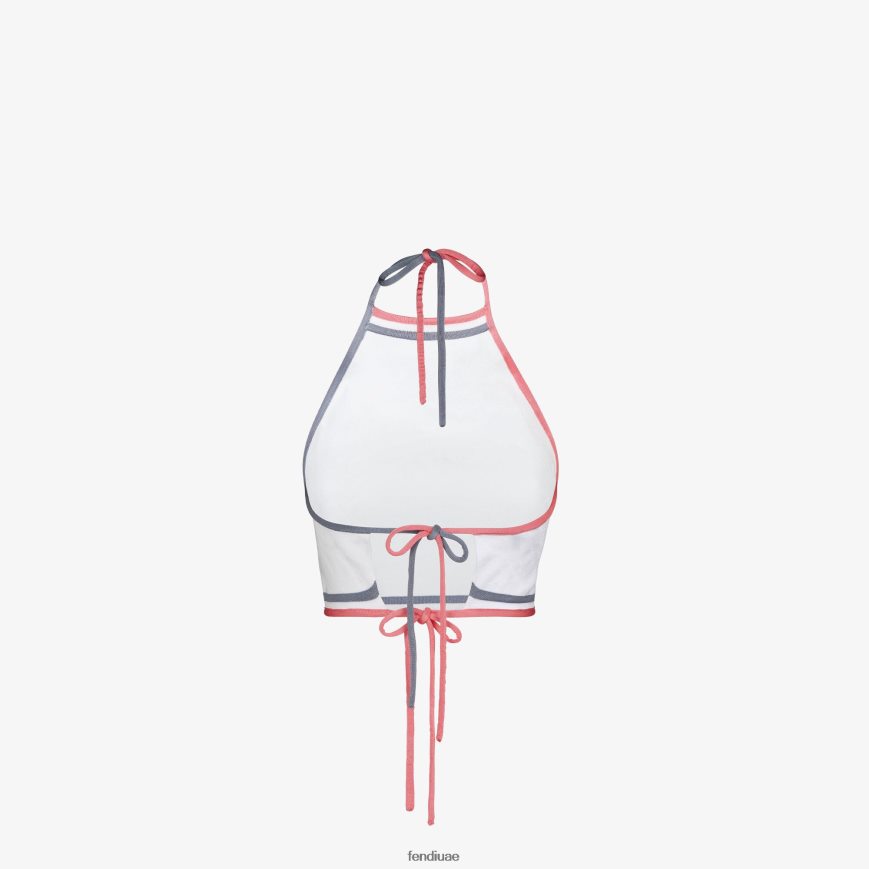 توب قصير بلا أكمام مع رقبة رسن. الأربطة التي تربط في الخلف. مصنوع من نسيج الفيسكوز الأبيض، مع زخارف إنتارسيا مرآة فندي باللون نفسه. مزين بحواف متباينة باللونين الوردي والأزرق الفاتح.