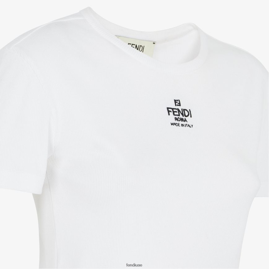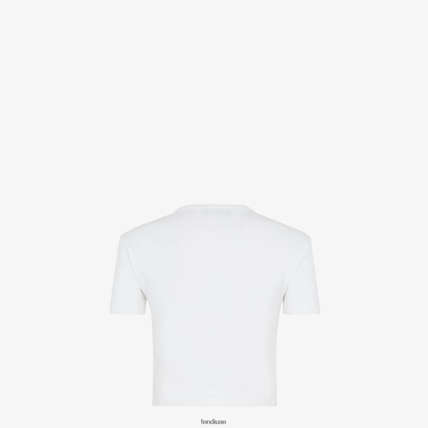 توب قصير بقصة ضيقة وياقة دائرية وأكمام قصيرة. مصنوع من قطن الجيرسيه الأبيض المضلع. مُخصص بطباعة شعار "fendi roma made in italy" المتباين الصغير على الجهة الأمامية.