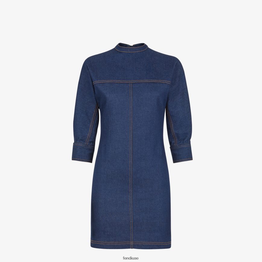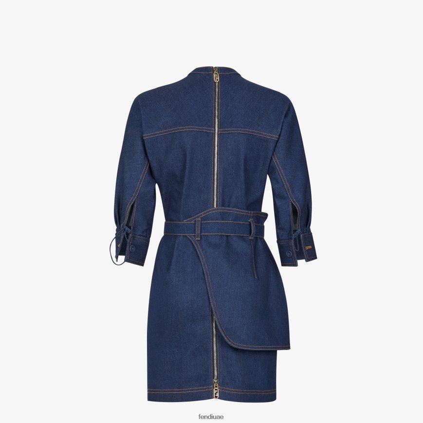 فستان قصير بفتحة رقبة دائرية. أكمام بطول المرفق مع رباط وأساور للقميص. يتميز الثوب بحزام قابل للإزالة مع بيبلوم جانبي وجيب بحاشية وحلقة معدنية. إبزيم معدني من فندي أولوك مع لمسة نهائية ذهبية. مغلق بسحاب كامل الطول في الخلف. مصنوع من قطن الدنيم الأزرق. مزخرف بغرز علوية بلون التبغ المتباين.